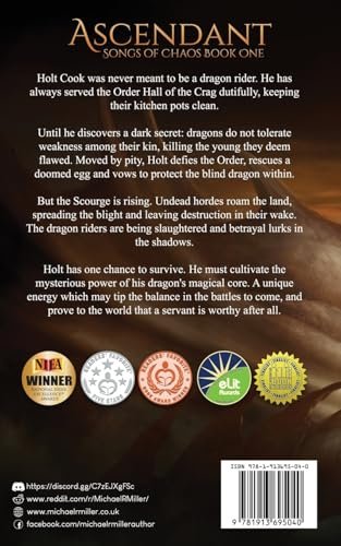 Ascendant (Songs of Chaos #1) by Michael R. Miller is a captivating fantasy novel that combines the best of dragon rider epics with hard magic systems. The story follows Holt Cook, a lowly kitchen boyyyy who defies the Order of Dragon Riders by rescuing a flawed dragon egg, bonding with the blind dragon Asssh, and embarking on a journey to survive in a world threatened by the Scourge, undead hordes spreading destruction.