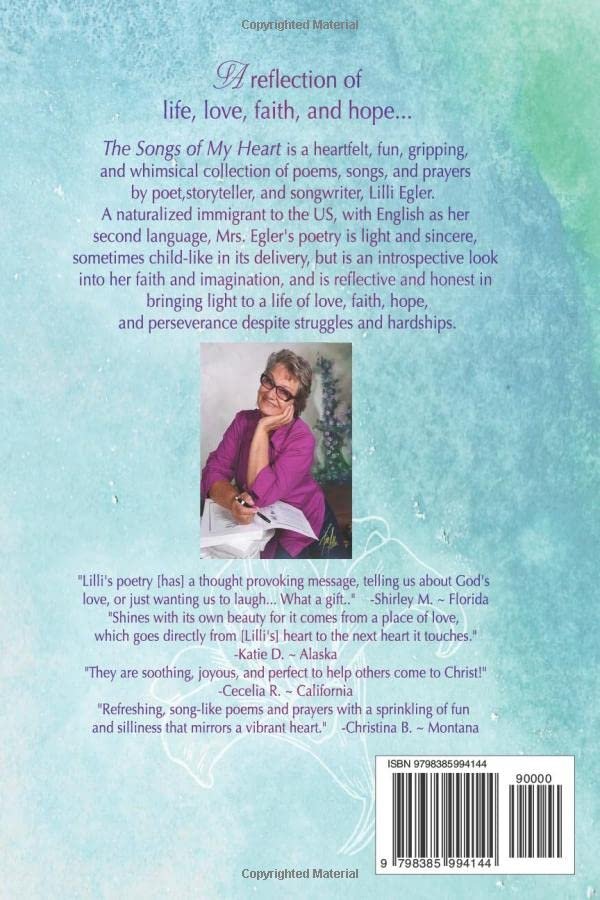 The Songs of My Heart is a heartfelt, fun, gripping, and whimsical collection of poems, songs, and prayers by poet, storyteller, and songwriter, Lilli Egler.